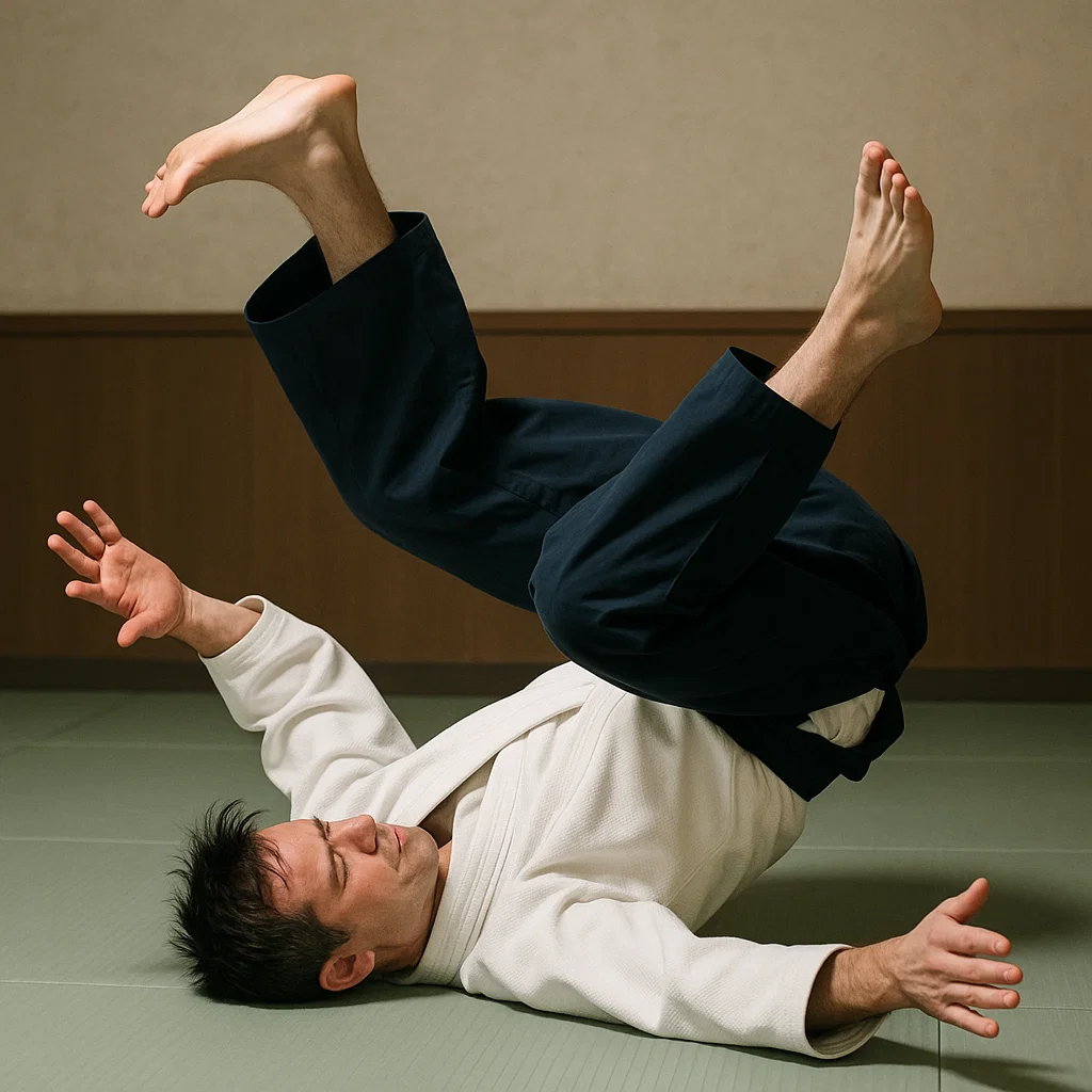 - Ushiro-ukemi: queda para trás, protegendo a nuca e distribuindo o impacto.